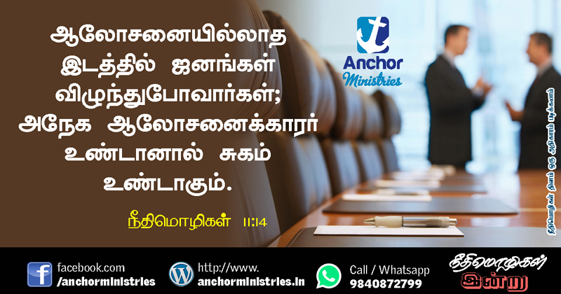 ஆலோசனையில்லாத இடத்தில் ஜனங்கள் விழுந்துபோவார்கள்; அநேக ஆலோசனைக்காரர் உண்டானால் சுகம் உண்டாகும். – நீதிமொழிகள் 11:14